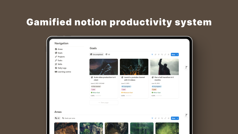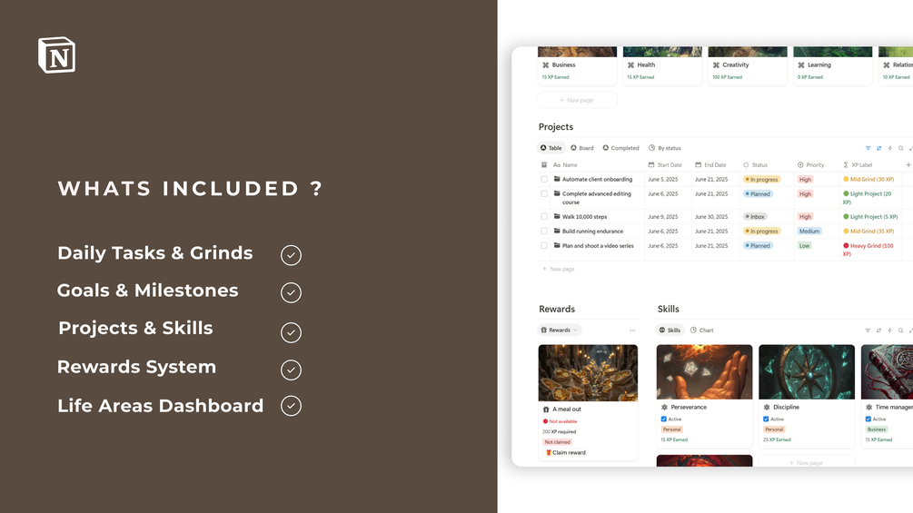 Itโs an all-in-one gamified life operating system built inside Notion โ where your goals become epic quests, your habits earn XP, and your daily actions actually feel rewarding.