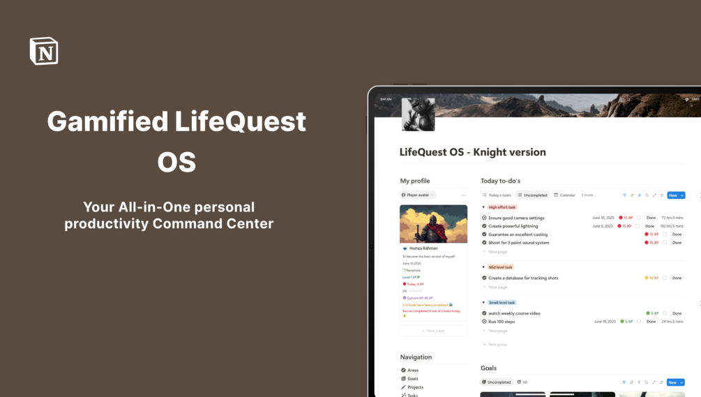 Itโ€™s an all-in-one gamified life operating system built inside Notion โ€” where your goals become epic quests, your habits earn XP, and your daily actions actually feel rewarding.