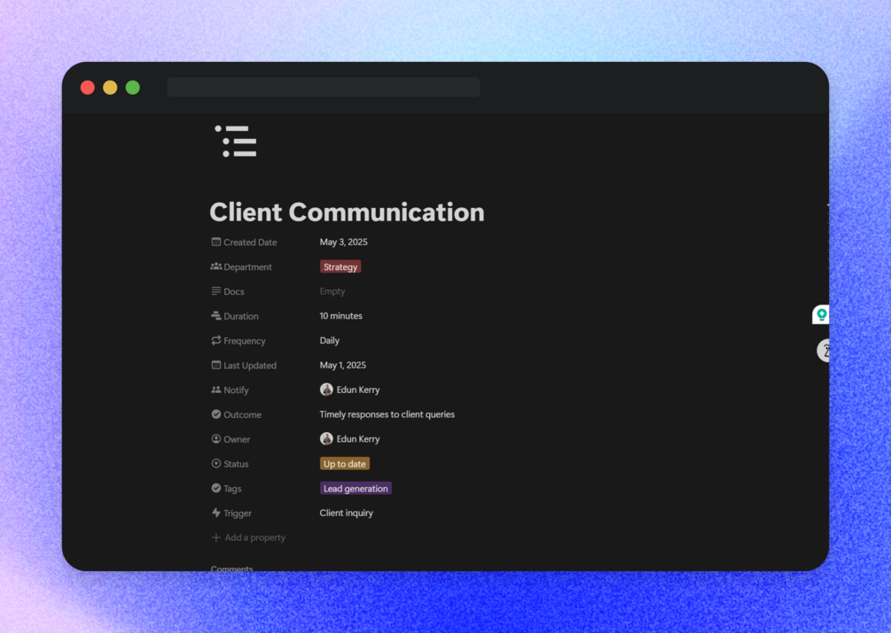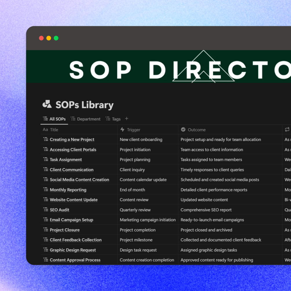I created 40+ SOPs to run our own agency, and over 100+ for client systems. These aren’t generic templates—they’re built to fix the chaos and create consistency across every department.